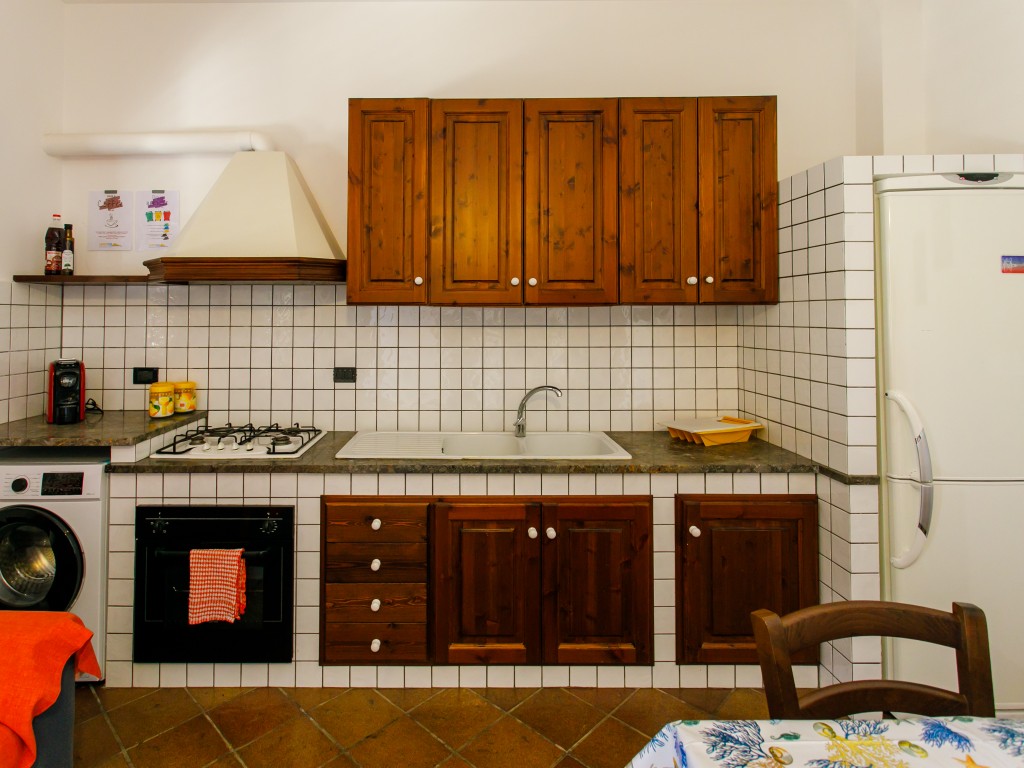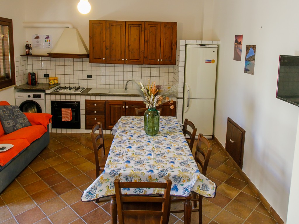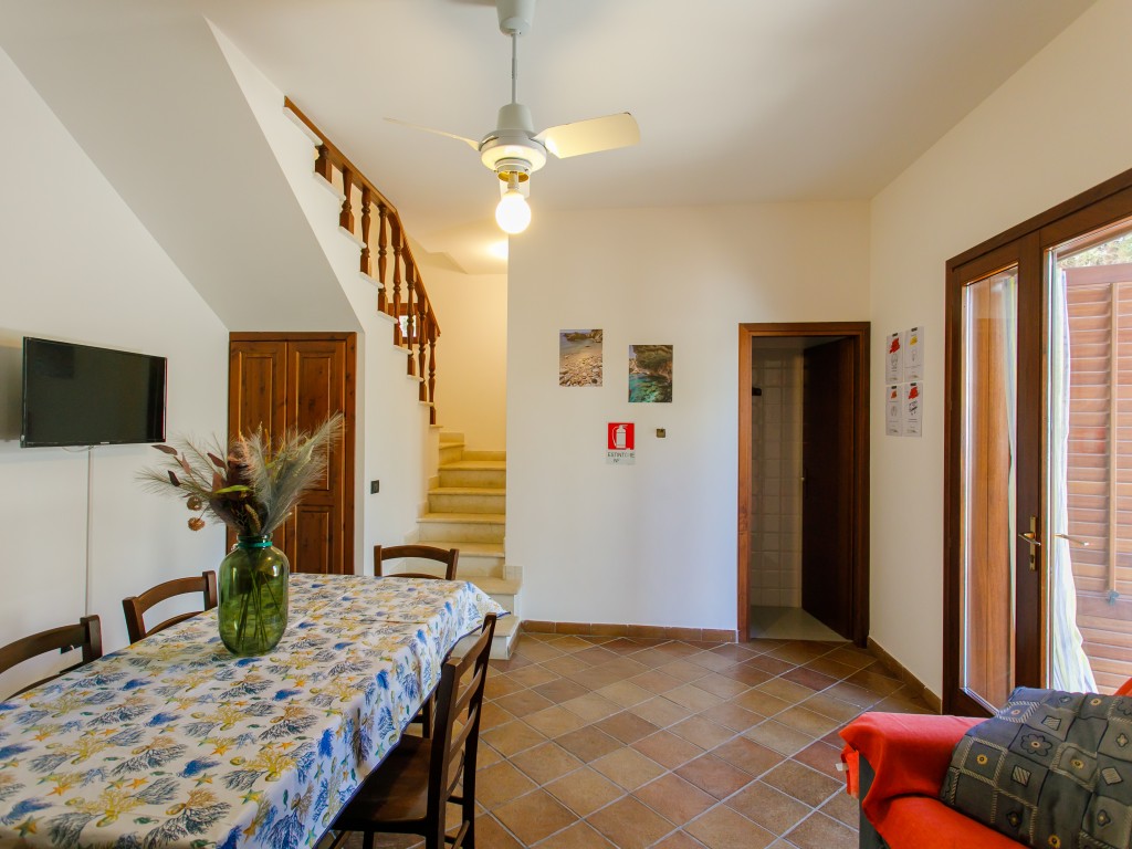 Il piano terra è composto da un ampio soggiorno con cucina in muratura (tv, frigo, forno, ventola soffitto, divano letto) e un bagno completo con doccia; il primo piano da due camere da letto (una con letto matrimoniale standard ed una con letto matrimoniale alla francese ), un secondo bagno privo di doccia ed un disimpegno. Entrambe le camere da letto risultano climatizzate.