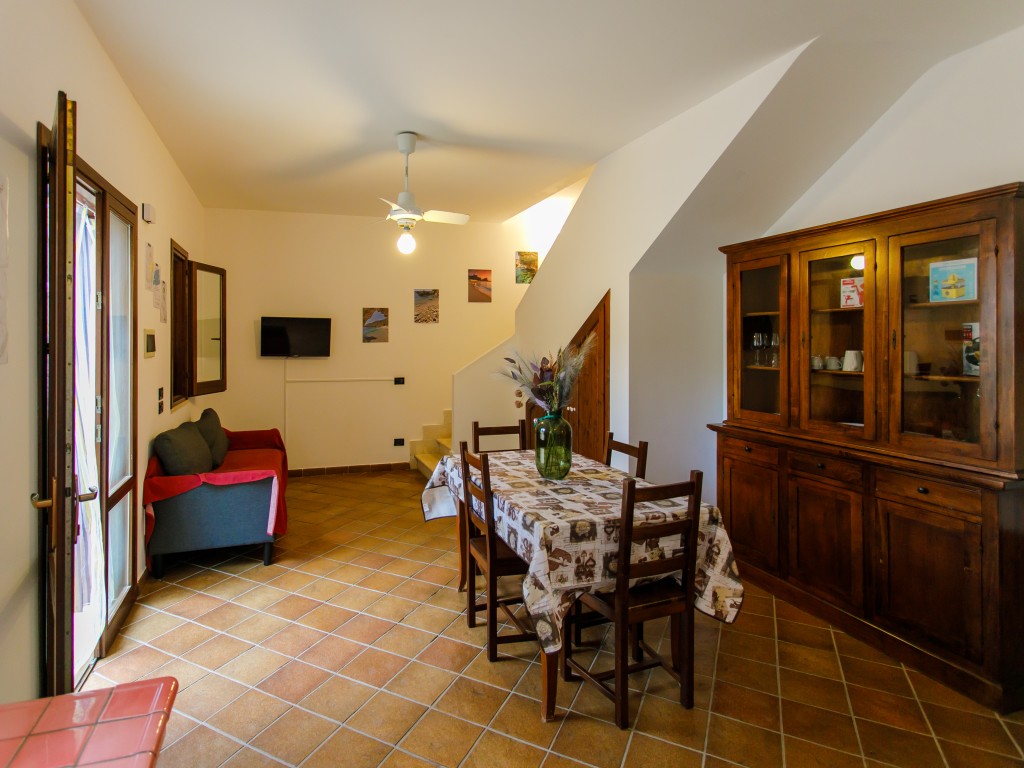 Il piano terra è composto da un ampio soggiorno con cucina in muratura (tv, frigo, forno, ventola soffitto, divano letto) e un bagno completo con doccia; il primo piano da due camere da letto matrimoniali (una con letto standard 190 * 160 cm ed una con letto a castello ), un secondo bagno privo di doccia ed un disimpegno. Entrambe le camere da letto risultano climatizzate.